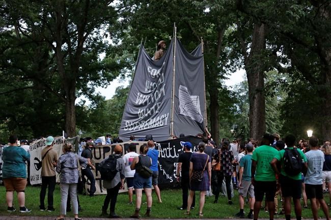 The police response Monday was much different from the response to a similar protest a year ago. In 2017, officers in riot gear faced criticism for heavy-handed tactics after using metal barricades to keep activists from getting near the statue. The portable barriers weren’t used Monday, and officers didn’t keep protesters away from the statue.