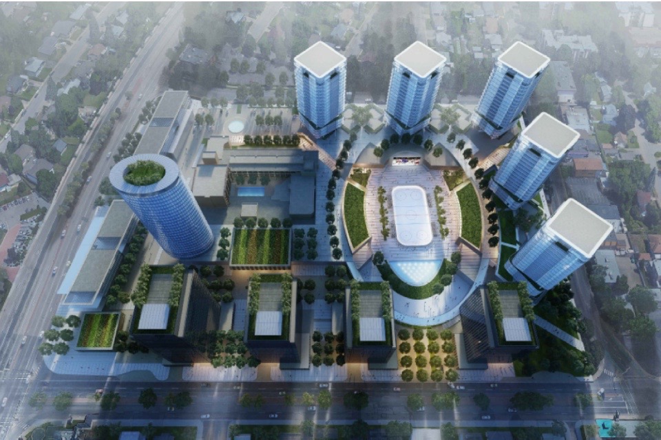 Should it reach full build-out, the site would eventually see as many as 15 low- and high-rise buildings and include an urban park with a full-sized hockey rink that doubles as an amphitheatre in the summer.