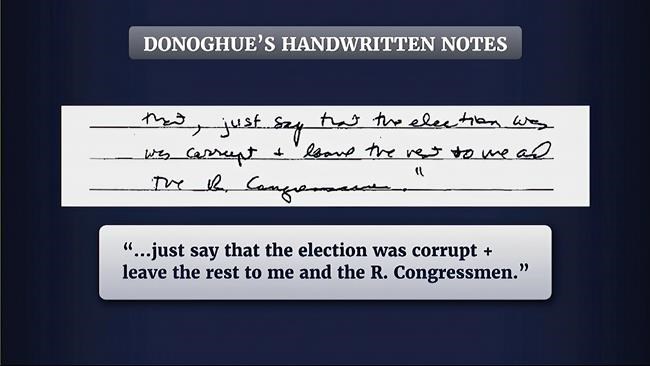 In one phone conversation, according to handwritten notes taken by Donoghue and highlighted at Thursday’s hearing, Trump directed Rosen to “Just say the election was corrupt and leave the rest to me and the R. Congressmen.”