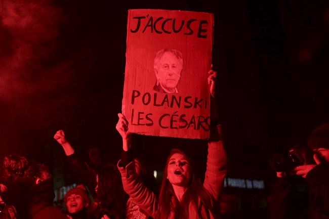 A few hundred protesters brandishing signs with phrases such as “Victims, we believe you” and “No to impunity” assembled outside the Salle Pleyel hall before the ceremony started. The group chanted, “We are here, we are here, even if Polanski doesn’t want to, we are here.”