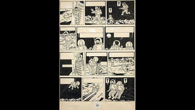 The original drawing in Chinese ink from the Belgian cartoonist Herge shows the fearless reporter, his white dog Snowy and his friend Captain Haddock in spacesuits, walking on the moon for the first time and looking at the Earth.