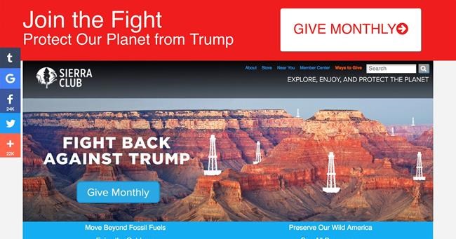 Like the ACLU, the Sierra Club, a leading environmental organization, moved swiftly to feature Trump in its fundraising appeals. It depicted him as an “outlier” who denies the dangers of climate change and would dismantle environmental protection regulations.