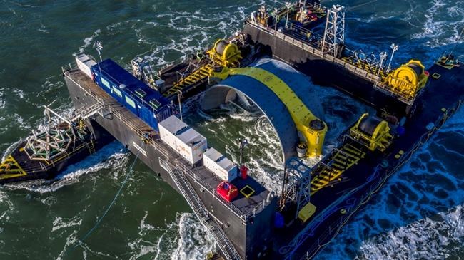 PARRSBORO, N.S. – A giant tidal turbine has been lowered into position on the Bay of Fundy seabed near Parrsboro, N.S., a “huge milestone” for a test project aiming to demonstrate the industry’s potential.