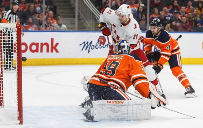 Carolina started the scoring four minutes into the opening period as Aho converted a three-way passing play, chopping the puck into an open net at the back door past Edmonton goalie Mikko Koskinen. It was Aho’s 17th goal of the season and 100th of his NHL career.