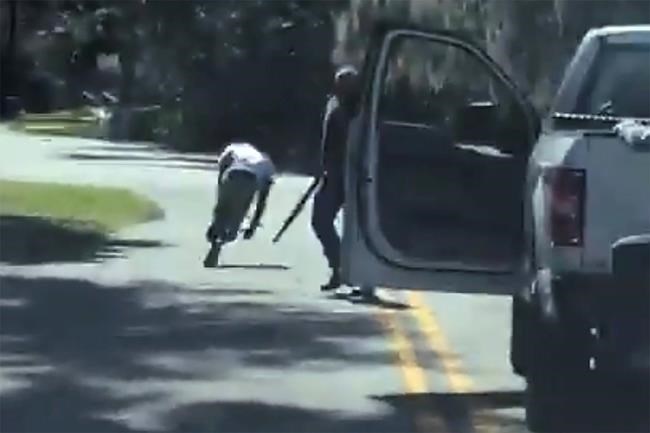 The leaked video shows a black man running at a jogging pace. The truck is stopped in the road ahead of him, with one of the white men standing in the pickup’s bed and the other beside the open driver’s side door.