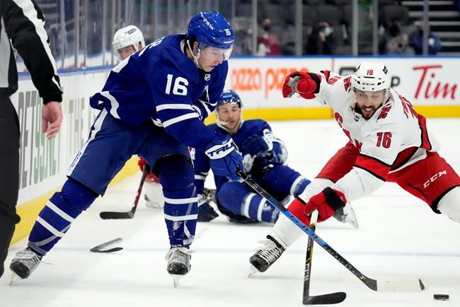 Marner and Matthews shared the spotlight Monday with backup goalie Petr Mrazek, who made 28 stops to defeat his old team. He was terrific after Matthews tied the game in the second period with a breakaway stop on Carolina centre Sebastian Aho.