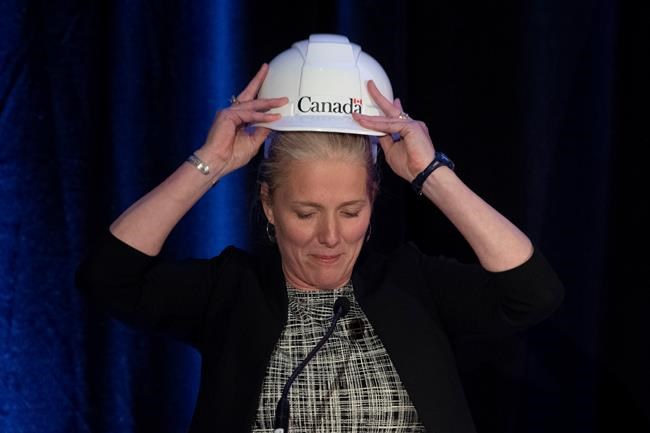 McKenna underscored her point by donning a white hard hat, emblazoned with the government of Canada logo.