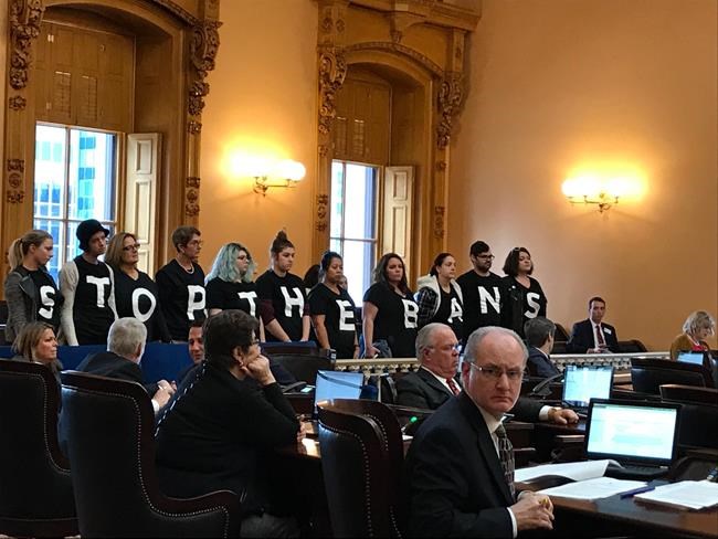 A group of abortion-rights activists staged a silent protest in the Senate chamber after the bill’s approval, standing in a row wearing T-shirts that spelled out “Stop the Bans.” Planned Parenthood planned a Statehouse protest rally on Thursday.