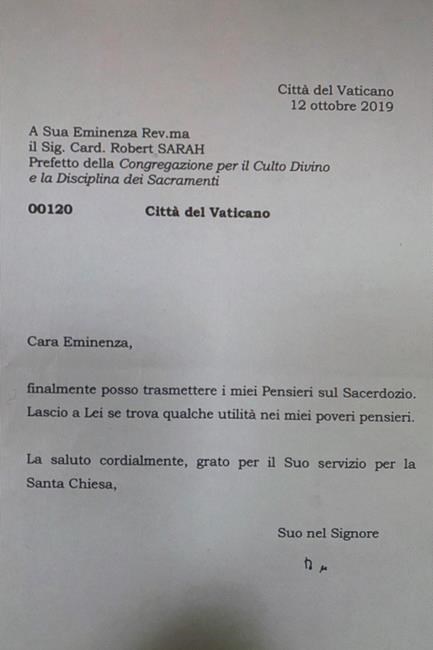 Sarah quoted his own correspondence to Benedict: “I imagine that you might think your reflections might not be opportune because of the polemics they might provoke in newspapers, but I am convinced that the whole church needs this gift, which could be published around Christmas or the start of 2020.”
