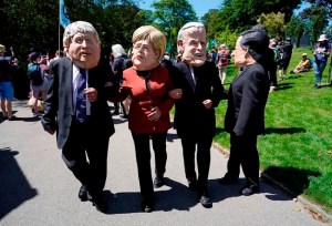 Earlier, activists from Oxfam assembled on Falmouth beach to protest climate change and put on masks depicting the leaders attending the G-7 summit.