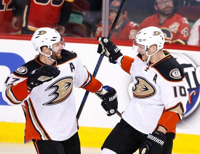 CALGARY – Corey Perry celebrated his 100th career playoff game scoring the overtime winner for the Anaheim Ducks in a 5-4 victory over the Calgary Flames on Monday.