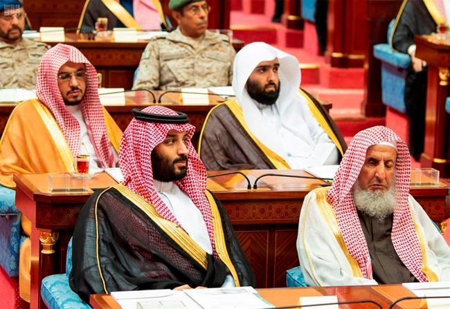 King Salman delivered his remarks in the ornate hall of the consultative Shura Council before the country’s ministers, senior officials, military officers and clerics. Prince Mohammed was in attendance and seated next to the country’s top cleric.