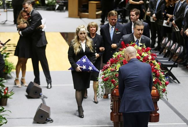 Seven of Huntsman’s children spoke during the service inside the University of Utah arena renamed in his honour 30 years ago. Nearly half of the lower bowl seats of the arena were filled.