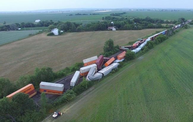 The Quebec Environment Department says 25 of the 95 rail cars derailed near Saint-Polycarpe on Monday night, but officials said there were no injuries or evacuations.