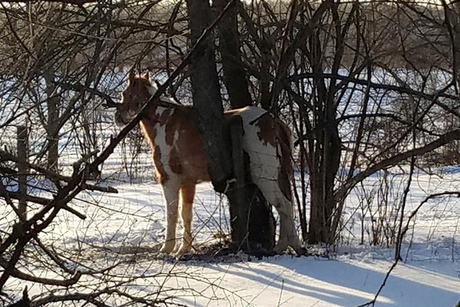 But when a neighbour brought a chain saw to the scene, Ball braved the frigid conditions for 45 minutes to cut away branches until the horse was able to pull free.