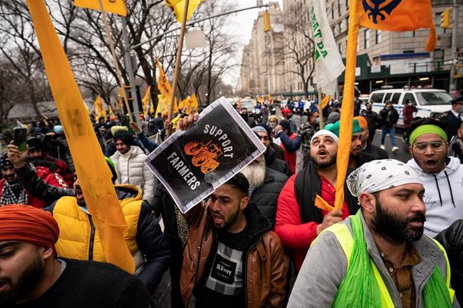 NEW YORK – Demonstrators showing solidarity with protesting farmers in India rallied Tuesday outside the Indian consulate in New York, some honking their car horns while others stood in the snowy weather, yelling slogans and waving flags.