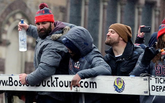 Fan favourite Rob Gronkowski, who went down with an injury before the team’s playoff run, energized the crowd with his typical Gronk antics. The tight end took off his shirt and chugged beers tossed up to the duck boats by fans, while other players held a wrestling championship-style belt over his head.
