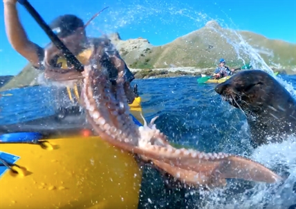 So done, he grabs an octopus and lets one of the kayakers have it.