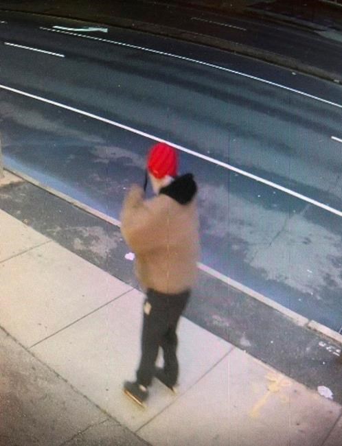 Along with the skates, the suspect was described as wearing a brown Carhartt jacket, blue sweatpants, red beanie cap and — in light of the coronavirus crisis — surgical mask, black rubber gloves, police said.