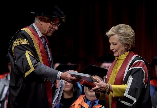 The 2016 U.S. presidential candidate spoke at Swansea University in Wales, which presented her with an honorary doctorate.