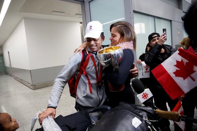 Akilah Thomas, whose son Akil scored the winning goal in Canada’s 4-3 win over Russia a day earlier, helped organize a group of over 30 friends and family members to welcome the players home at Pearson International Airport.
