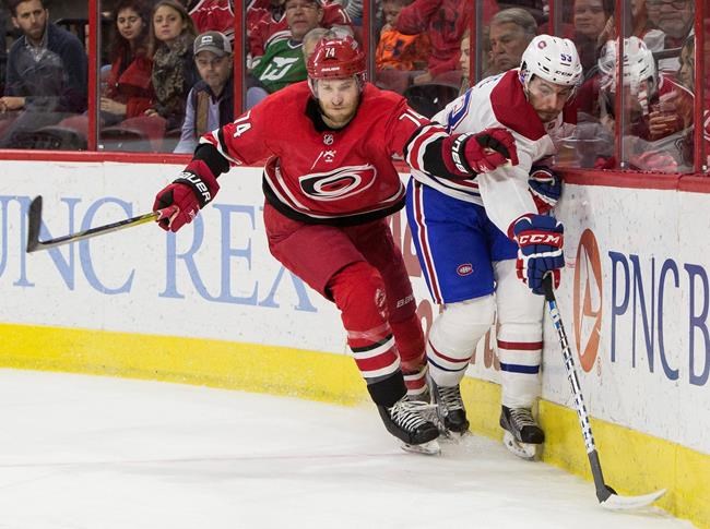 NOTES: Montreal LW Paul Byron was back in the lineup two nights after leaving the Canadiens’ loss to St. Louis following a fall into the boards. … Pesce’s goal was his first since Jan. 14, 2017 — a span of 81 games. … Montreal assistant Kirk Muller spent three seasons as Carolina’s head coach.
