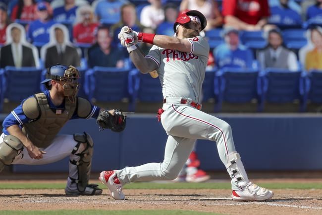 Harper replaced Scott Kingery in right in the sixth inning. Harper popped up a bunt for an out with two on and one out in the eighth with the Phillies down 9-4, then stranded two on the ninth with a game-ending strikeout on a full-count fastball from Jeremy Beasley, the eighth pitch of the at-bat.