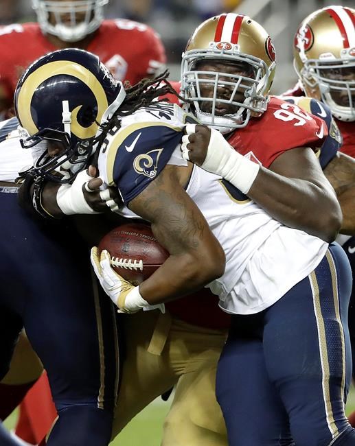 STAR EJECTION: Rams defensive lineman Aaron Donald was ejected in the fourth quarter when he made contact with an official. The infraction came after Rams linebacker Alec Ogletree gave an extra push to Gabbert following a scramble. As players on both teams started jawing, Donald pushed a 49ers player and then made contact with an official. Donald was called for two personal fouls on the play and ejected.