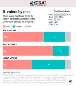 Biden drew his core supporters in Illinois, including women, moderate and conservative voters, older voters and African Americans. Sanders enjoyed support from two-thirds of voters under 30, though voters ages 30 through 44 split about evenly between him and Biden.
