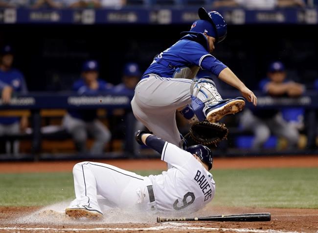 Bauers put Tampa Bay ahead in the fourth inning and the Rays went on to an 8-4 victory over the Toronto Blue Jays on Monday night.