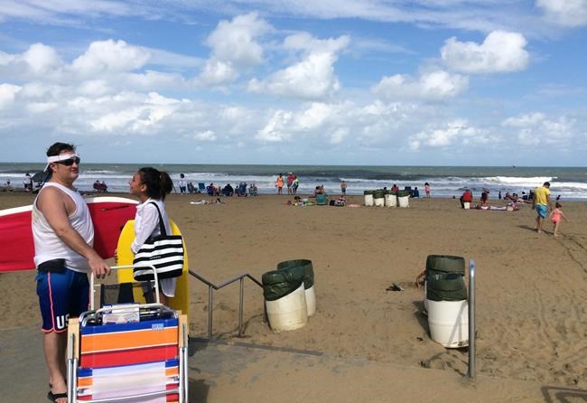 The waves eroded some of the shore, creating sand dune cliffs where kids climbed. Warnings of potentially dangerous riptides temporarily cleared the water Monday, but a couple of dozen beachgoers and a handful of surfers returned to the water in Atlantic City by the afternoon. A rougher surf cleared portions of the beachfront.