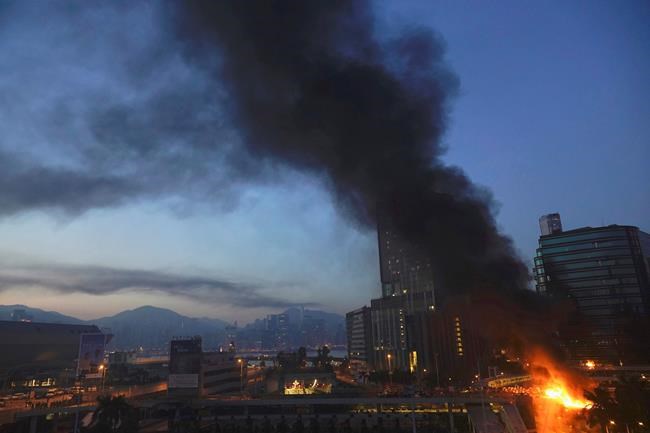 A huge blaze burned along much of a long footbridge that connects a train station to the campus over the approach to the Cross-Harbour Tunnel, a major road under Hong Kong’s harbour that has been blocked by protesters for days.