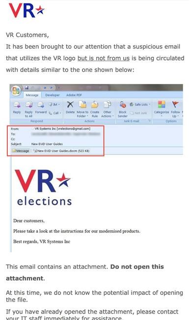In June 2017, the federal Election Assistance Commission informed dozens of local voting officials that hackers had attempted to penetrate the systems of a voting system manufacturer, presumed by many to be VR.