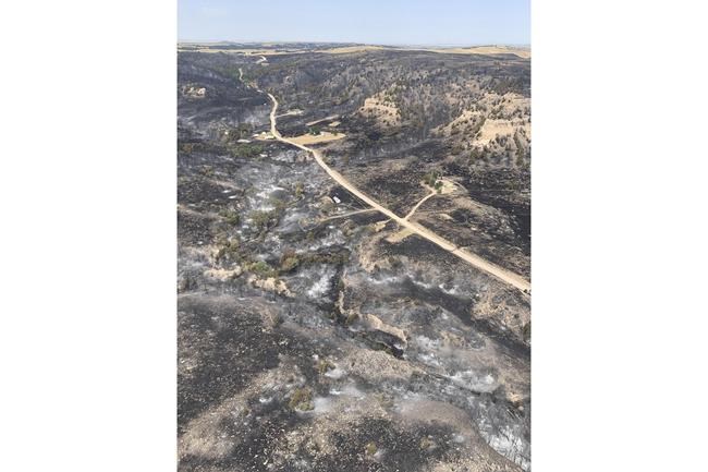 The wildfire has scorched about 25 square miles (65 square kilometers) of mostly grass and timberland, destroying three homes and damaging several others over the weekend. Officials confirmed late Tuesday that the fire was started by several lightning strikes Saturday evening. It gained ground early on due to tinder-dry conditions, rough terrain and high winds.