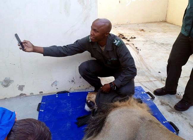 Photos taken on Wednesday show the darted lion sprawled out in the cell, surrounded by onlookers. One police officer took advantage of the lion’s tranquilized state to take a selfie.