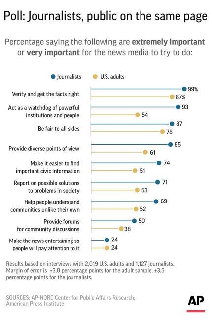 Public suspicion about journalism is also fueled by some basic misunderstandings on how the process works, particularly in an era of rapid change, according to the twin surveys of the American public and journalists released Monday by the Media Insight Project. The effort is a collaboration between The Associated Press-NORC Center for Public Affairs Research and the American Press Institute.