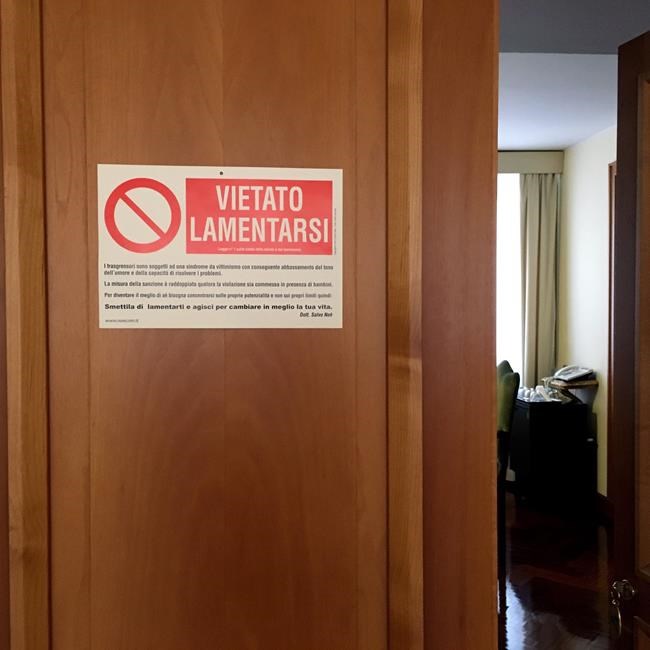 He has hung a sign on the door of his hotel suite reading: “No Whining.” In smaller print the sign continues: “Transgressors are subject to a syndrome of victimization and the ensuing reduction of a sense of humour and capacity to resolve problems. Sanctions are doubled when the violation is committed in the presence of children.”