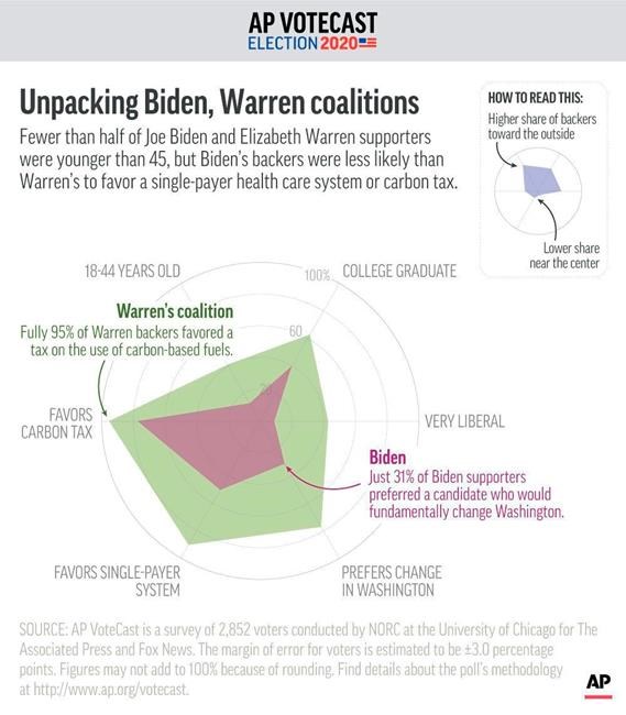 Bernie Sanders got a boost from younger voters. Pete Buttigieg connected with voters who want to dramatically change the political system but view themselves as moderates. Elizabeth Warren drew much of her support from college graduates and women. Joe Biden appealed to older voters who saw a chance to recapture an era before President Donald Trump. And Amy Klobuchar built a coalition of older women and moderates.
