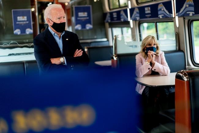 Instead, the Bidens’ private car on Wednesday featured a “Ridin’ with Biden” sign. His campaign also affixed Biden placards and signs urging supporters to text “Ohio” to the campaign, which staffers took down when the train crossed into Pennsylvania. Other signs billed the train as the “Build Back Better Express” a nod to Biden’s plan for post-coronavirus pandemic economic recovery.