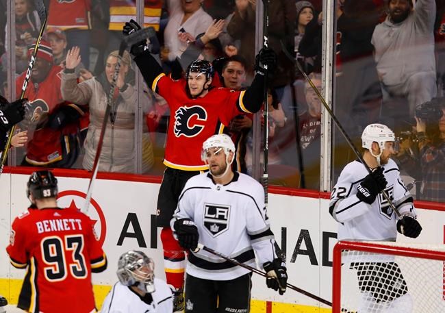 Sean Monahan and Micheal Ferland had a goal and an assist each and Johnny Gaudreau chipped in two assists as the Flames scored four times in the second period for a thrilling 4-3 comeback victory over the Los Angeles Kings.