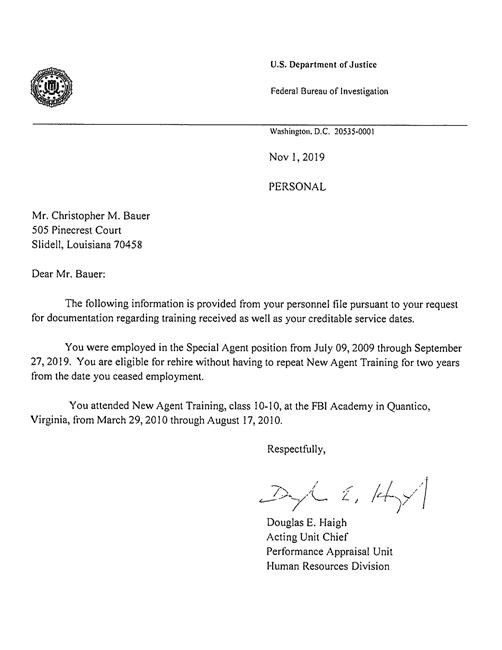 Bauer indicated on his application that he was still employed by the FBI and had never been dismissed or forced to resign because of disciplinary action. And the state’s law enforcement credentialing commission provided AP a copy of a letter — purportedly from FBI headquarters — that makes no mention of Bauer’s ouster, confirms his decade of “creditable service” and deems him “eligible for rehire.”