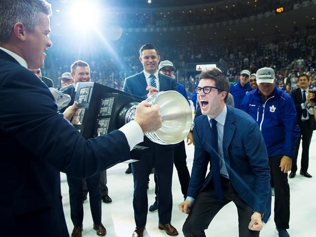 Dubas was passed the trophy during on-ice celebrations by head coach Sheldon Keefe, screaming with joy before emphatically raising it over his head.