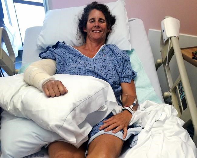 It shows Maria Korcsmaros grinning in her hospital bed, a cast covering nearly the entire length of her right arm.