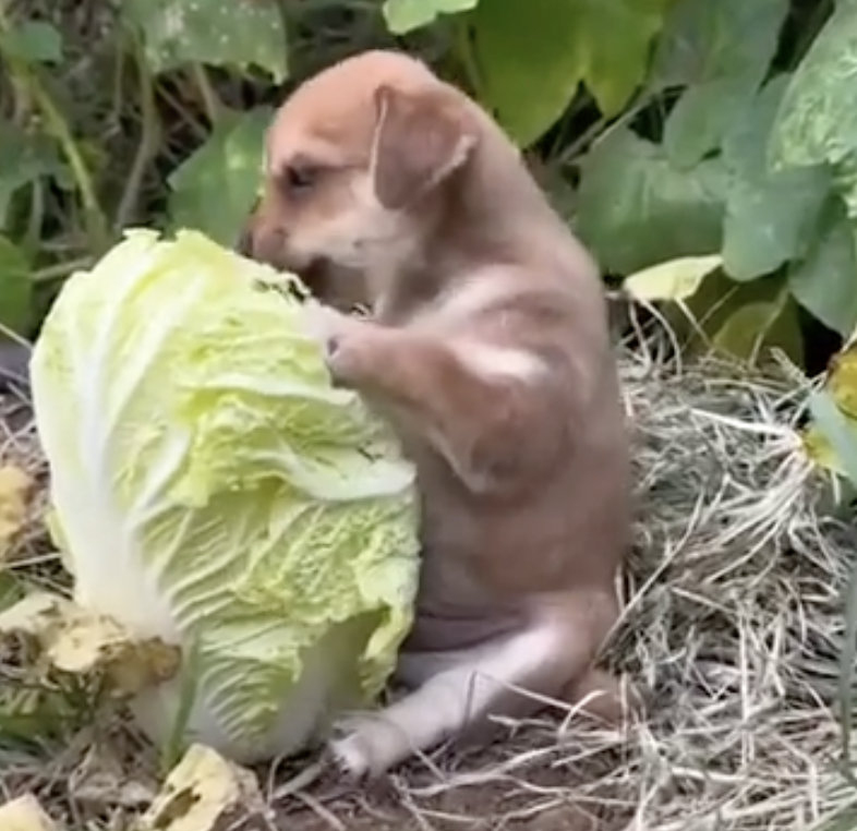 A puppy trying to eat a cabbage, that's definitely cute.