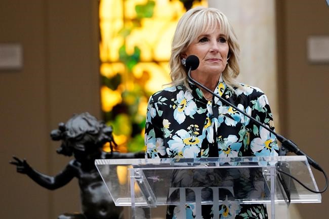 Also among the first: Jill Biden. The first lady toured the exhibit at a preview Monday morning and spoke of how she’s learned, in her current job, that language isn’t the only means of communication — fashion is, too. “We reveal and conceal who we are with symbols and shapes, colors and cuts, and who creates them,” Biden said.