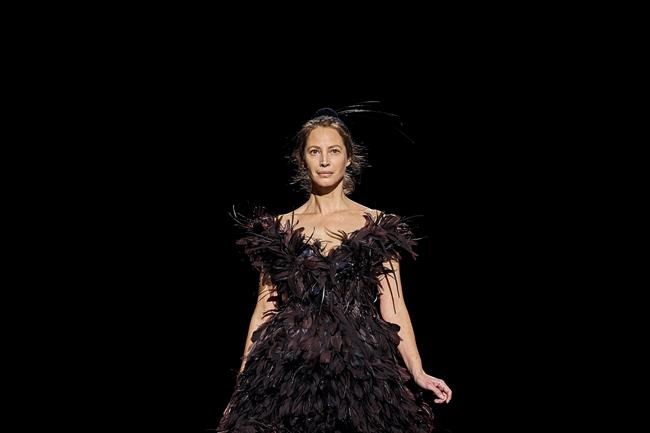 Besides his trademark showmanship, he had a surprise up his sleeve: famed ’90s supermodel Christy Turlington, a month after turning 50, closing the show in a voluminous black-feathered dress with matching feathered fascinator.