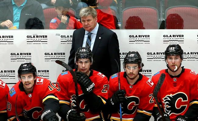 GLENDALE, Ariz. – Calgary coach Bill Peters needed eight stitches in his left jaw after being hit with a puck during the Flames’ 6-1 victory over the Arizona Coyotes on Sunday.