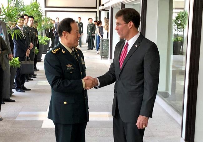 Col. Wu Qian spoke to reporters Monday after the Chinese minister of defence, Gen. Wei Fenghe, met with U.S. Defence Secretary Mark Esper on the side of an Asia defence officials conference.