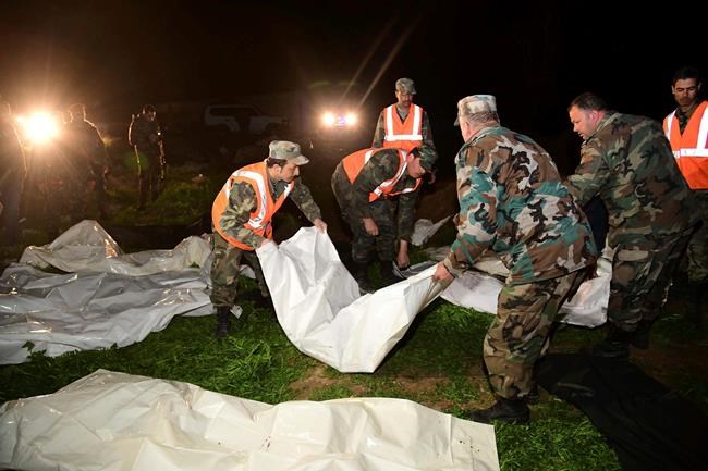 Ayman Khallou, a forensic doctor at a military hospital, told Syria’s state news agency that most of the remains found in the mass grave were handcuffed. He said most of the bodies appeared to have gunshot wounds to the head, while some were strangled. The official provided no immediate evidence to support the claim. Human rights groups blame both sides in the conflict for carrying out atrocities in the civil war.