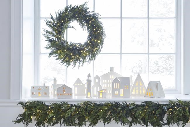 If your vibe is contemporary, West Elm, for instance, has a collection of ceramic-and-wood, minimalist buildings and trees. Or create your own modern neighborhood with ceramic ranch houses and split levels, from Crate & Barrel. All will glow nicely at night with some battery-operated tealights.